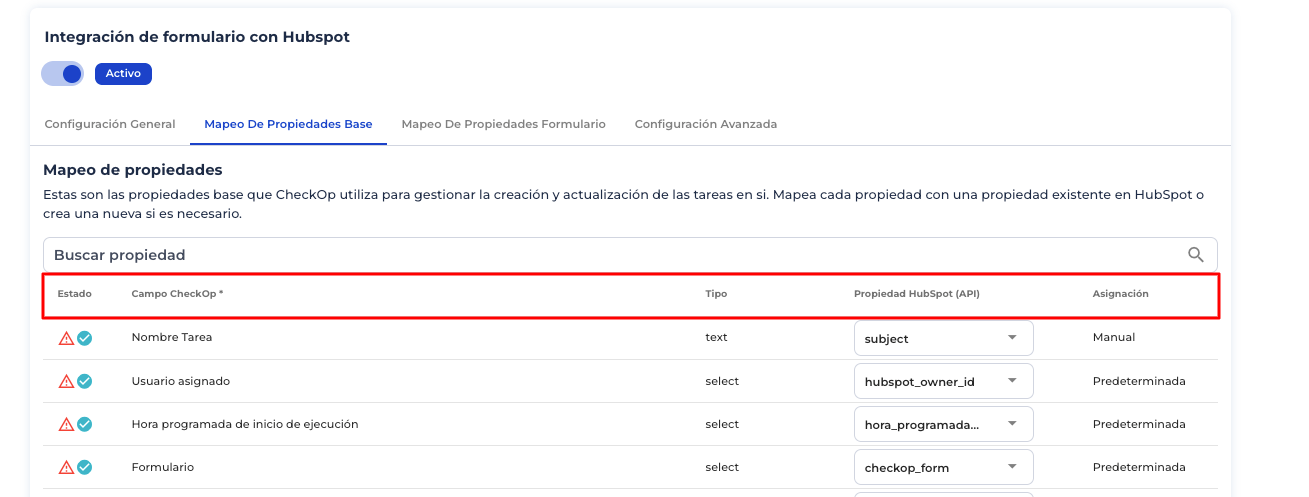 Actualización de estados: los cambios en los estados de tareas o formularios en CheckOP se reflejan en las etapas del pipeline configurado en HubSpot, manteniendo la sincronización operativa.