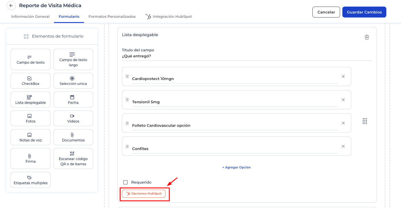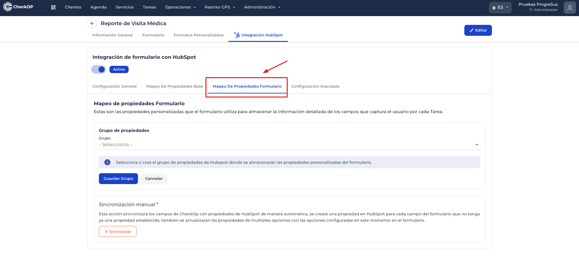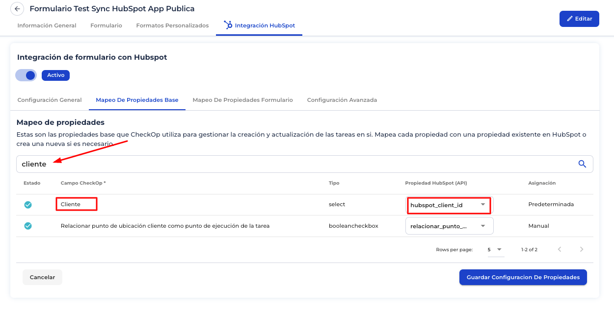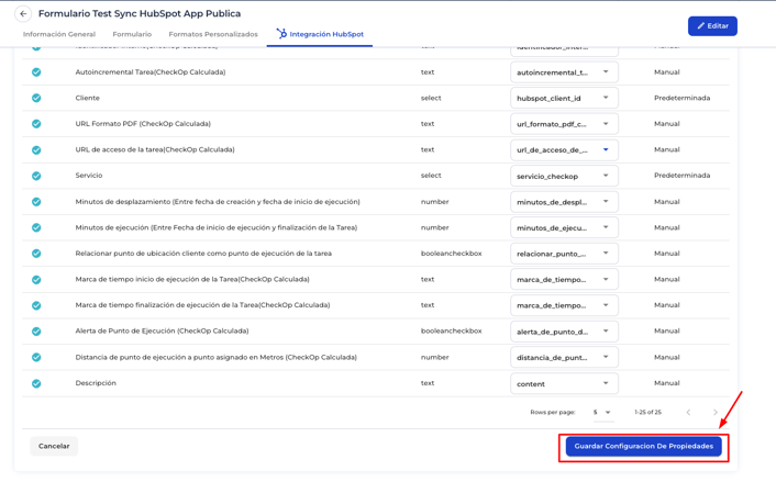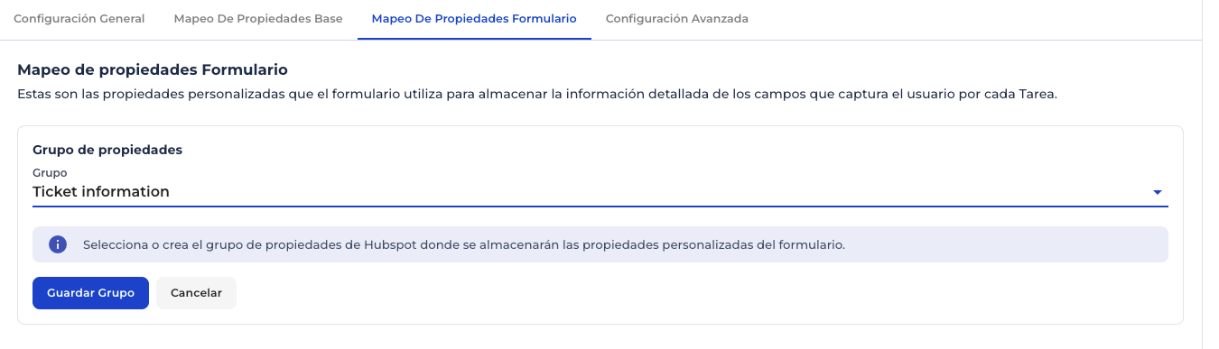 - Ir a la pestaña Integración HubSpot → Mapeo de Propiedades Formulario.