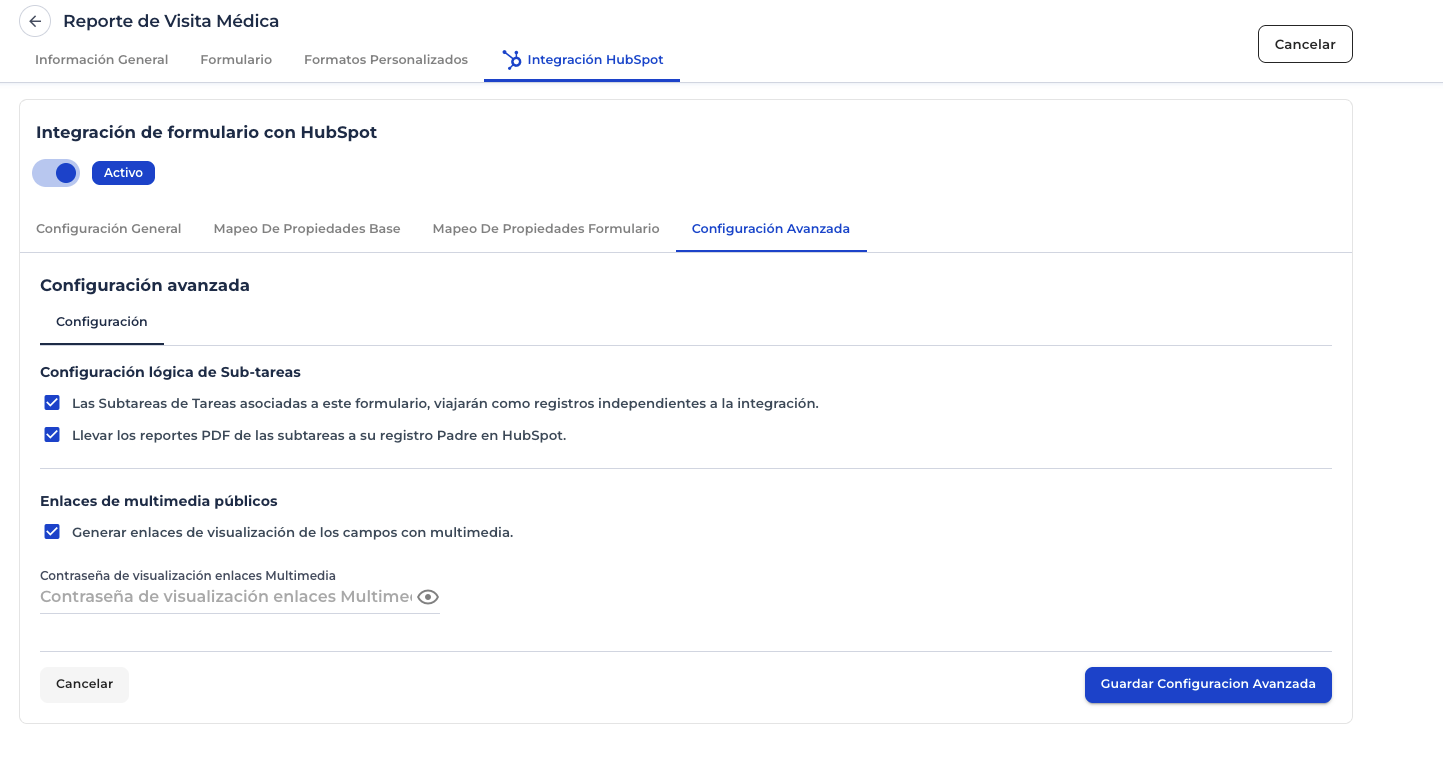 Definir las configuraciones avanzadas disponibles en la integración de un formulario CheckOP con HubSpot, relacionadas con la sincronización de subtareas, la gestión de archivos multimedia y la seguridad en enlaces públicos.